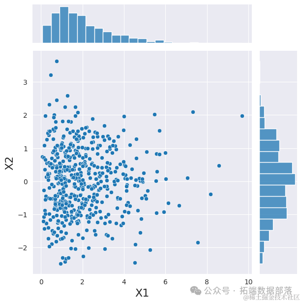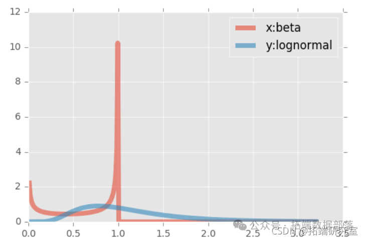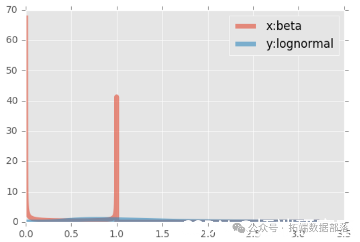 我们将从β分布中抽取(x)的样本,从对数正态中抽取(y)的样本。这些样本是伪独立的(我们知道,如果你用计算机来抽取样本,就不会有真正的独立,但好在是合理的独立)。