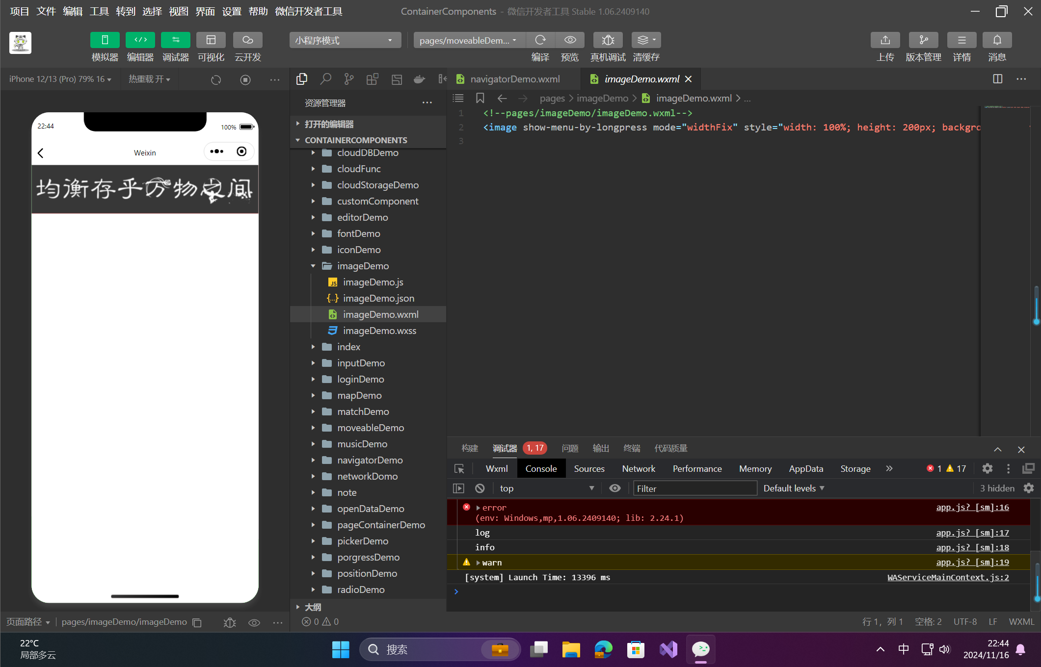 image 是小程序中用来渲染图像的组件,首先来看它是如何使用的。在示例工程的 pages 文件夹下新建一组名为 imageDemo 的页面文件,在 imageDemo.wxml 中编写如下示例代码: