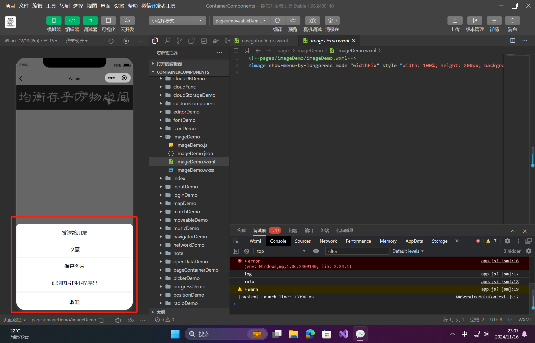 第二个是 show-menu-by-longpress 属性,show-menu-by-longpress 属性设置为 true 后,长按图片会触发图片处理菜单。这是小程序提供的一个功能,支持对图片进行分享、收藏、保存以及识别图片中的二维码。