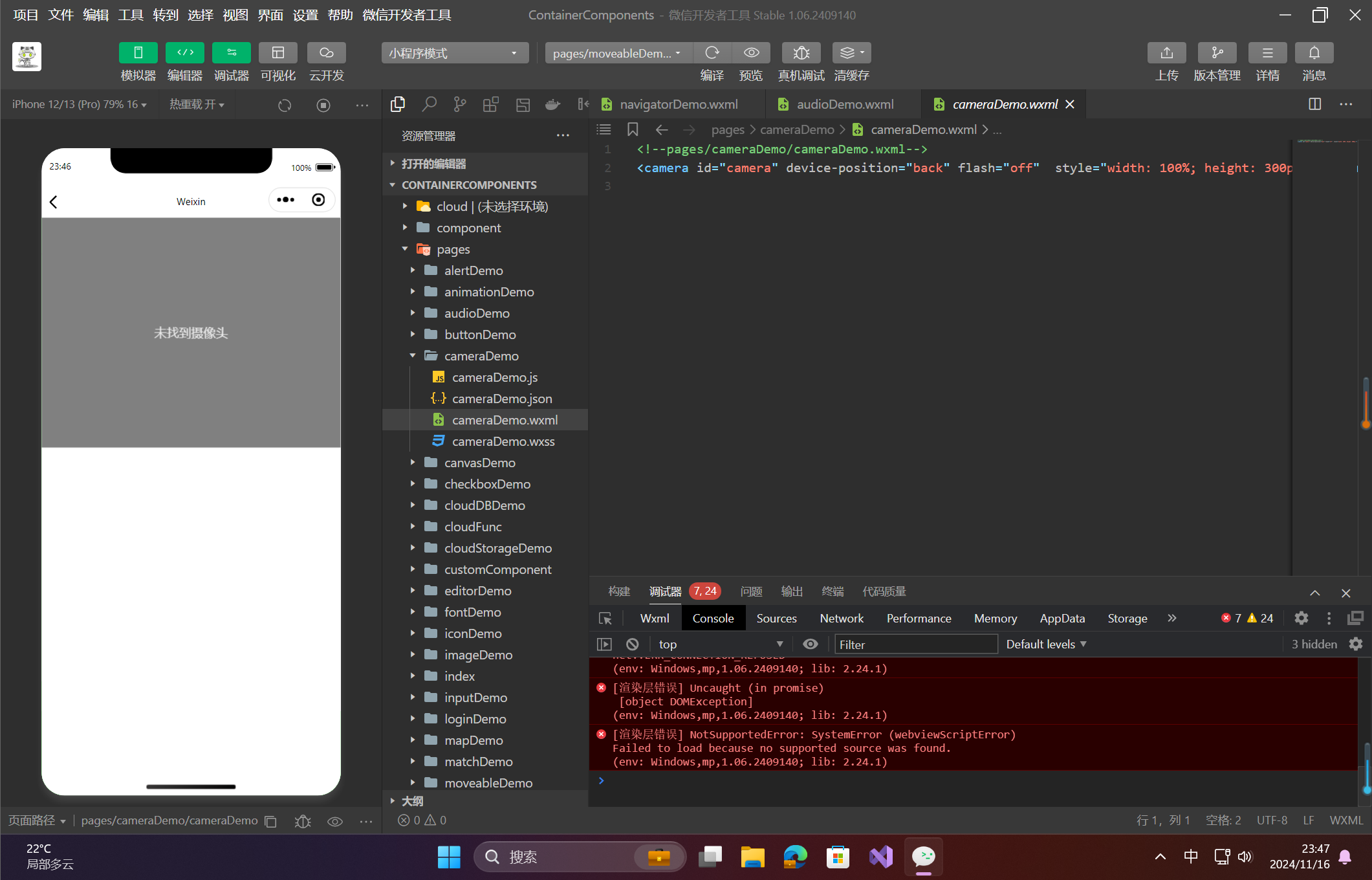 camera 组件与硬件中的相机模块相关。通过 camera 组件可以方便地获取到用户设备摄像头捕获到的实时影像数据。当然使用此功能时会要求用户给予授权。camera 组件本身使用非常简单,在示例工程的 pages 文件夹下新建一组名为 cameraDemo 的页面文件,在 cameraDemo.wxml 文件中编写如下示例代码: