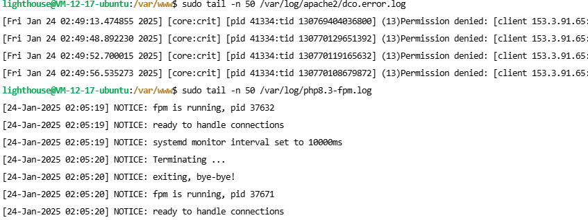 sudo tail -n 50 /var/log/apache2/dco.error.logsudo tail -n 50 /var/log/php8.3-fpm.log