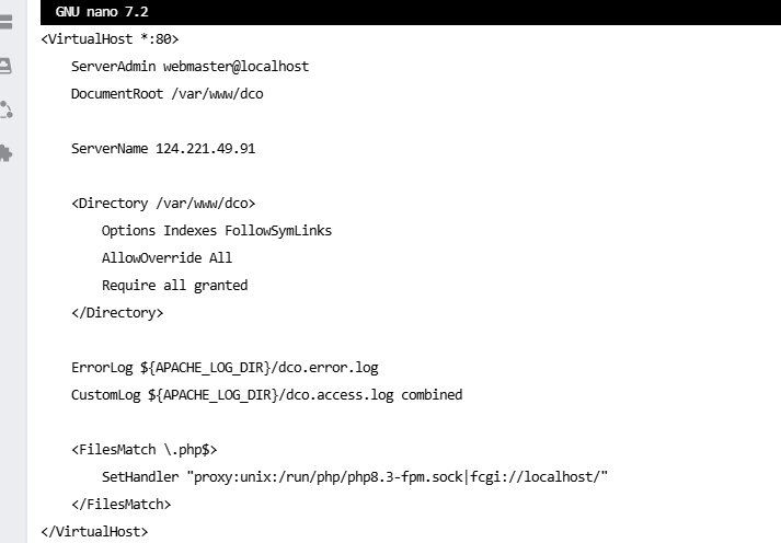 sudo nano /etc/apache2/sites-available/dco.conf将以下内容粘贴到dco.conf文件中: