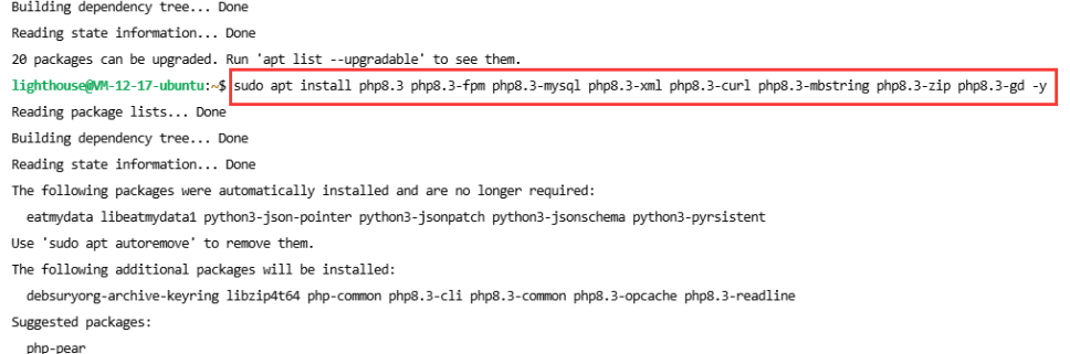 sudo apt install php8.3 php8.3-fpm php8.3-mysql php8.3-xml php8.3-curl php8.3-mbstring php8.3-zip php8.3-gd -y