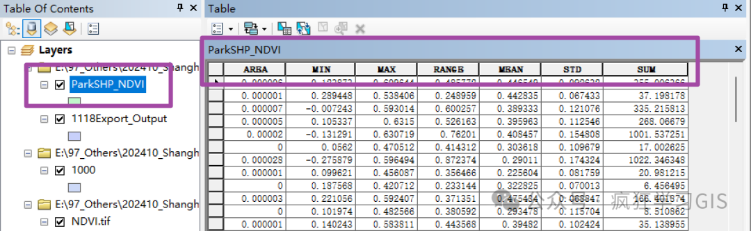 可以看到,其按照我们所选的字段,分别对每一个矢量面中,遥感影像的不同统计值加以了计算,如下图所示。