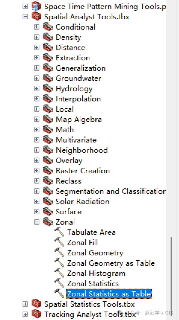 知道了需求,即可开始操作。其中,我们依次选择“Spatial Analyst Tools.tbx”→“Zonal”→“Zonal Statistics as Table”工具,如下图所示。