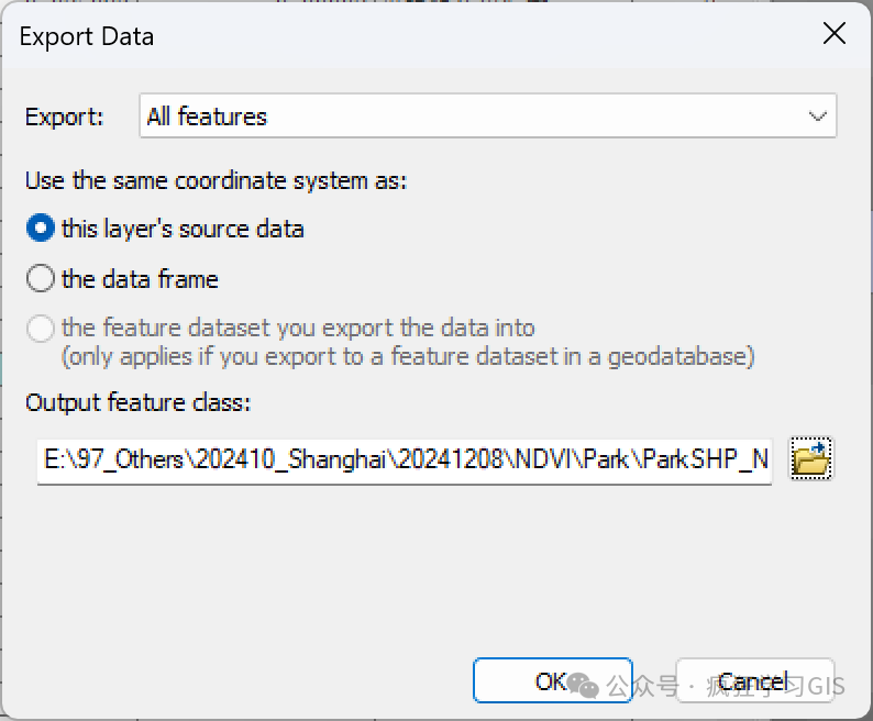 注意选择导出的范围为“All features”,并配置好导出图层的路径与文件名称,如下图所示。