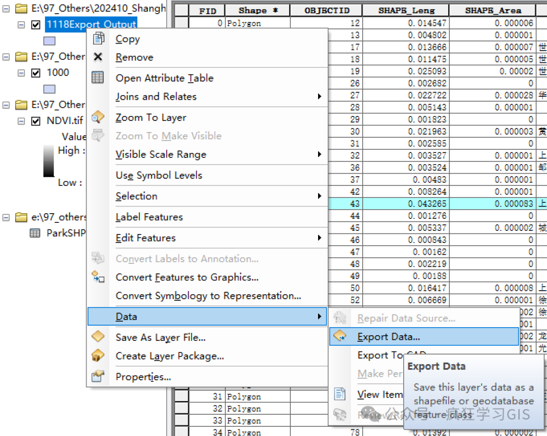 依然在矢量要素集上右键,选择“Data”→“Export Data”选项,如下图所示。