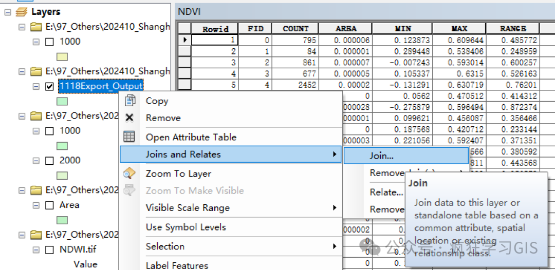 这个操作也很简单。在矢量要素集上右键,选择“Joins and Relates”→“Join”选项,如下图所示。