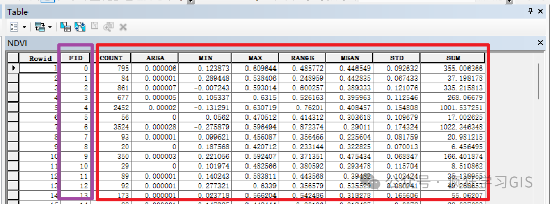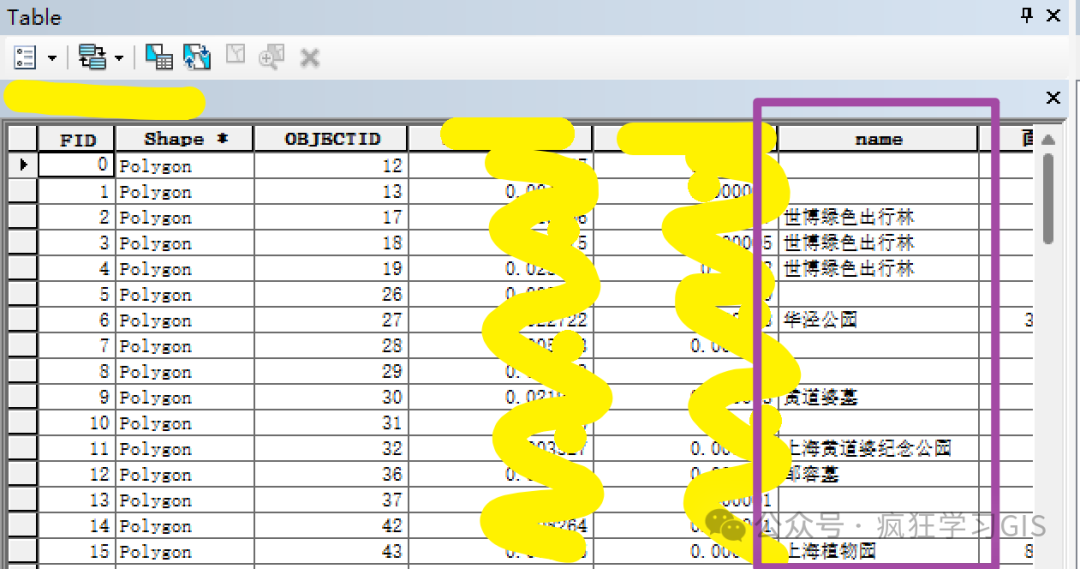 但是,因为我这里是基于FID这个字段来区分不同的面的,但是光看一个FID我也不知道这个面是哪一个面,所以希望可以将带有区域名称的矢量数据的属性表(也就是本文开头的第二张图片),与我们上述工具计算得到的结果表匹配起来。