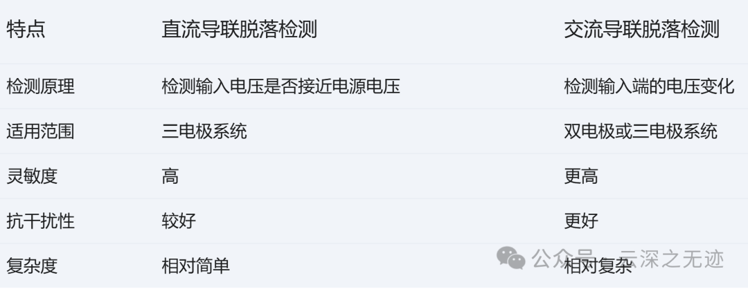 由于采用高频小电流,对低频噪声不敏感。不仅适用于三电极系统,也适用于双电极系统。但是无法确定具体脱落电极: 只能检测到有电极脱落,无法确定是哪个电极。
