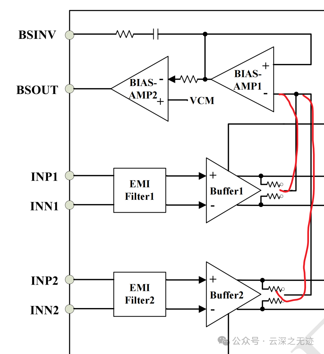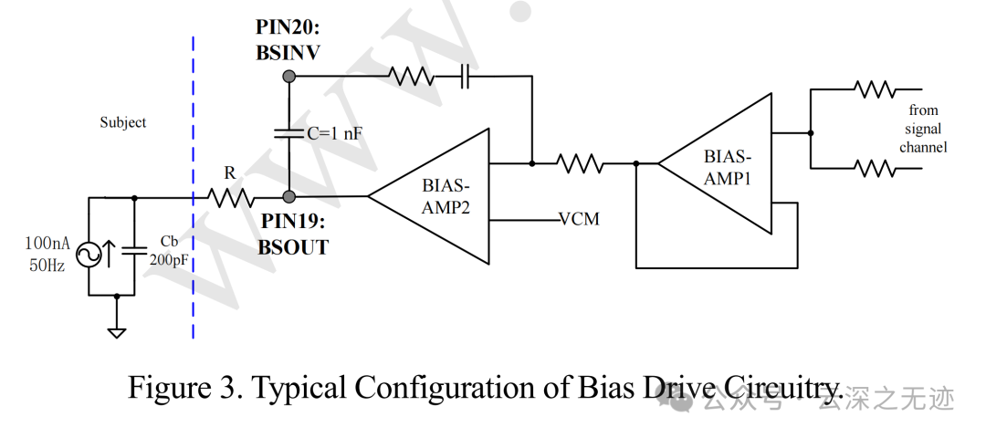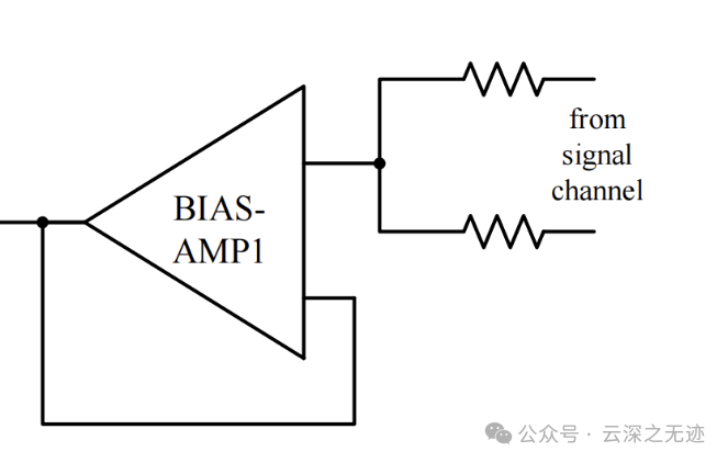 偏置放大器(BIAS-AMP)对两个输入端(BSIN+和BSIN-)的信号进行差分放大,得到共模信号。