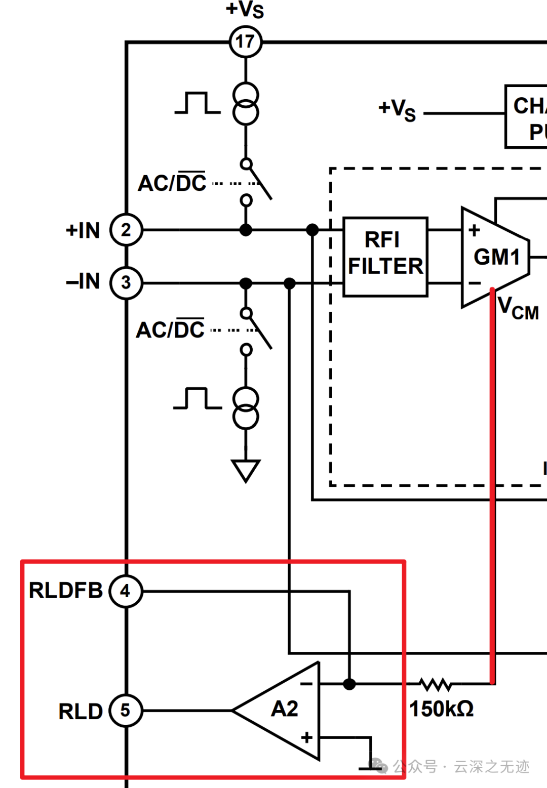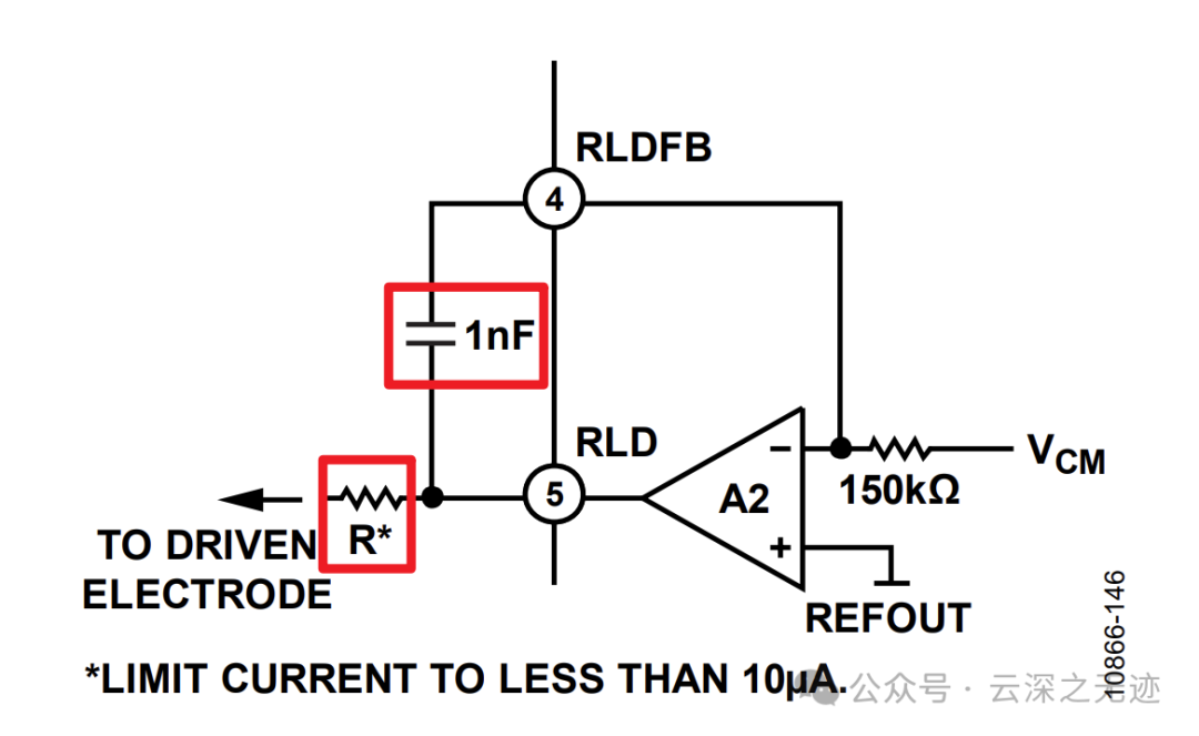 仪表放大器输入端上的共模信号从跨导放大器GM1获得。然后,通过一个150 kΩ电阻连接到A2的反相输入端。可在RLD FB和RLD引脚之间连接一个电容来构建一个积分器。