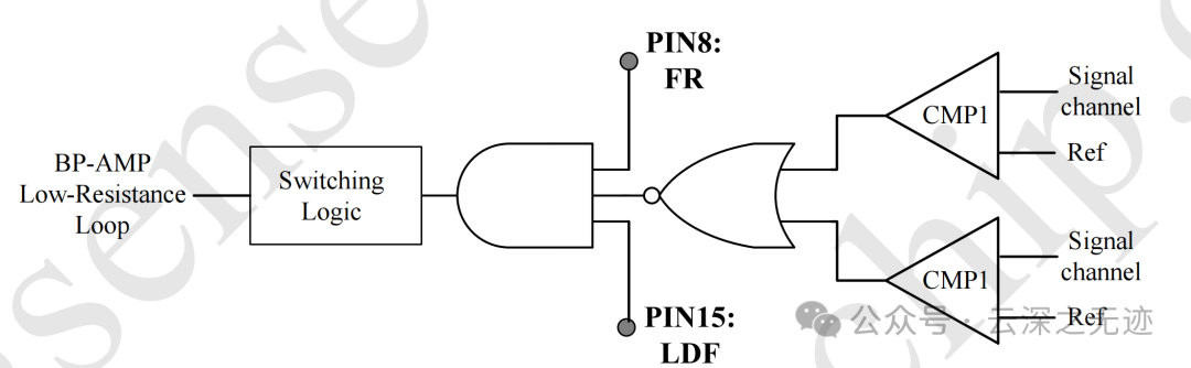 信号通道的输出连接到窗口比较器,当输出信号达到饱和状态时,窗口比较器产生触发信号。触发信号触发开关逻辑,在BP-AMP的输入端和输出端之间建立一个低阻抗回路。由于低阻抗回路的存在,信号能够更快地稳定下来。经过一段时间的延迟后,低阻抗回路断开,电路恢复正常工作。
