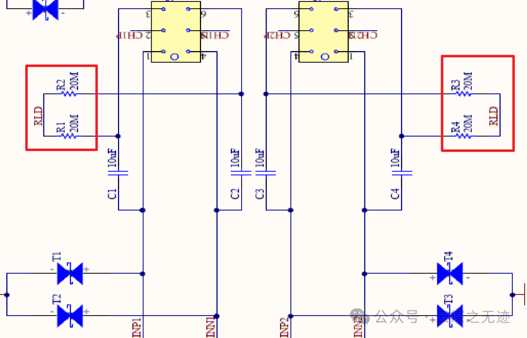 上拉电阻将输入端连接到正电源,为仪表放大器提供一个参考电位。限制了流过电极的电流,保护患者安全。当导联脱落时,输入端电压会接近正电源电压,触发报警。(上拉电阻值过大,会降低电路的输入阻抗,影响信号采集;过小,则可能导致功耗过大。)