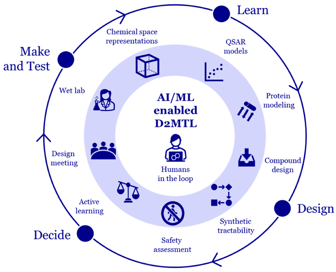 D2MTL(Design-Decide-Make-Test-Learn)的概念是由MA引入的,作为成熟的DMTA循环的演变。“Decide”的加入强调了选择阶段与主动学习相结合的重要性,此时优先考虑由人类和机器组合生成的分子设计。我们建议在工作流程中建立高效的Decide阶段是实现卓越分子设计和确保项目顺利进行的关键。这种合作活动不仅为药物优化过程提供了结构,还有助于我们的团队建立对药物和计算化学更深入的相互理解。将“Analyze”替换为“Learn”表征药物化学家的学习以及预测模型的评估和再训练。这种新的工作方式需要与快速综合和测试进行高度集成,以提高循环效率。图2说明了这个概念,并显示了本文中描述的应用程序如何适应。