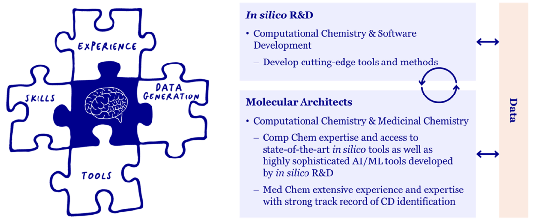 AI设计工具的出现,加上基于物理的方法的日益影响和HPC成本的降低,促使一些制药公司探索不同的工作方式。在Evotec,我们有一个AI/ML研发小组(计算机研发或isRD),负责将尖端技术调整和集成到我们的技术堆栈中,还有一个运营小组(分子架构师或MAs),他们将这些技术应用于与化学团队合作的发现项目和我们的合作伙伴。MA的概念(如图1所示)是融合药物和计算化学的经验和专业知识,在数据科学和计算机工具的基础上工作。我们认为它是建立信任、实现雄心勃勃的目标和加快潜在候选药物发现的有力推动者。MA确保(i)使用正确的工具和方法,无论其来源如何,也无论它们是否使用AI/ML,(ii)数据干净且易于理解,(iii)项目目标明确且得到满足,以及(iv)创建定制的计算管道与高效的可操作DMTA工作流程相结合,以最少的化合物数量测试给定的设计假设。