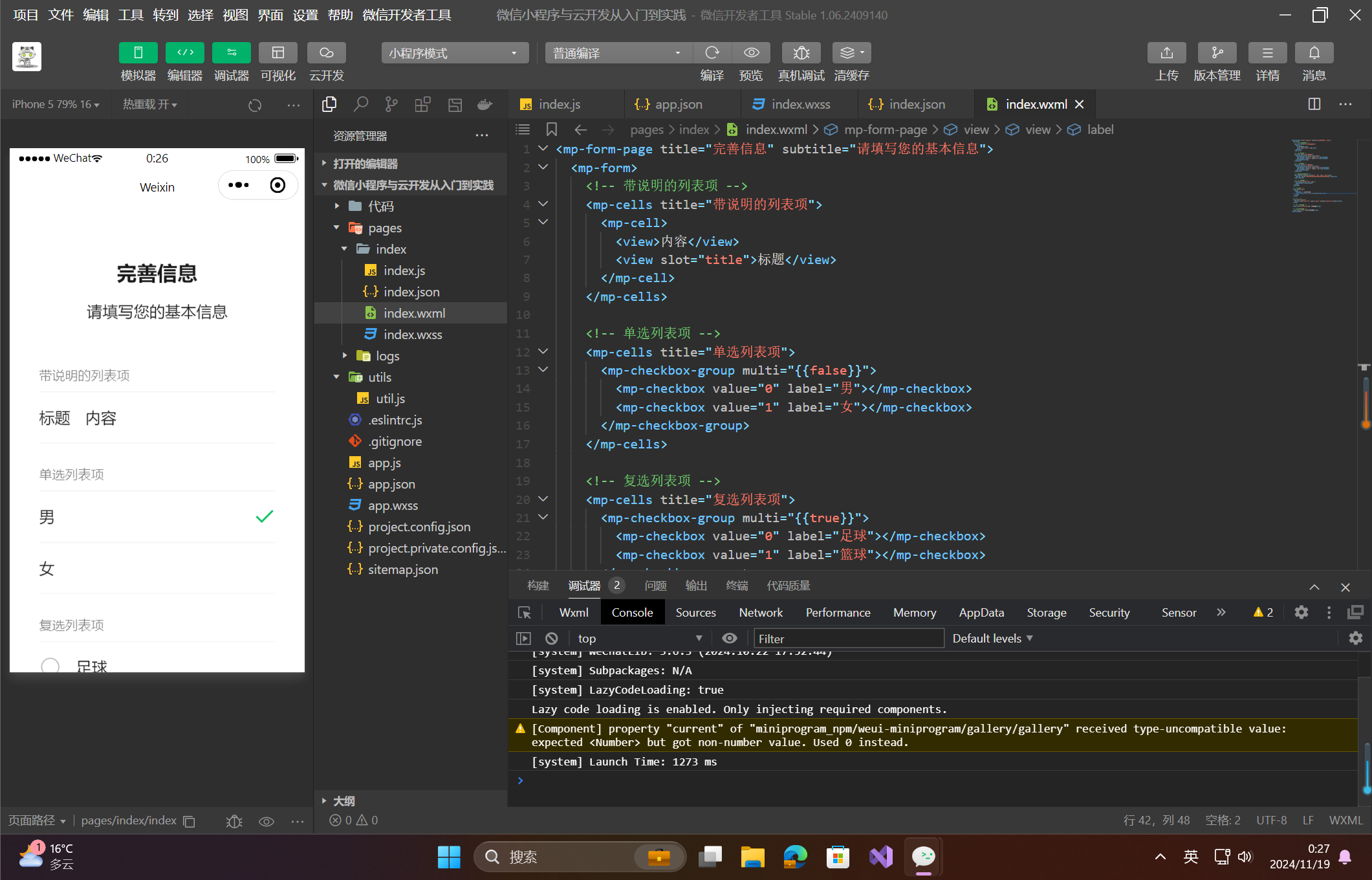 首先,我们来体验一下 WeUI 中提供的表单类组件。在页面配置文件中引入如下自定义组件: