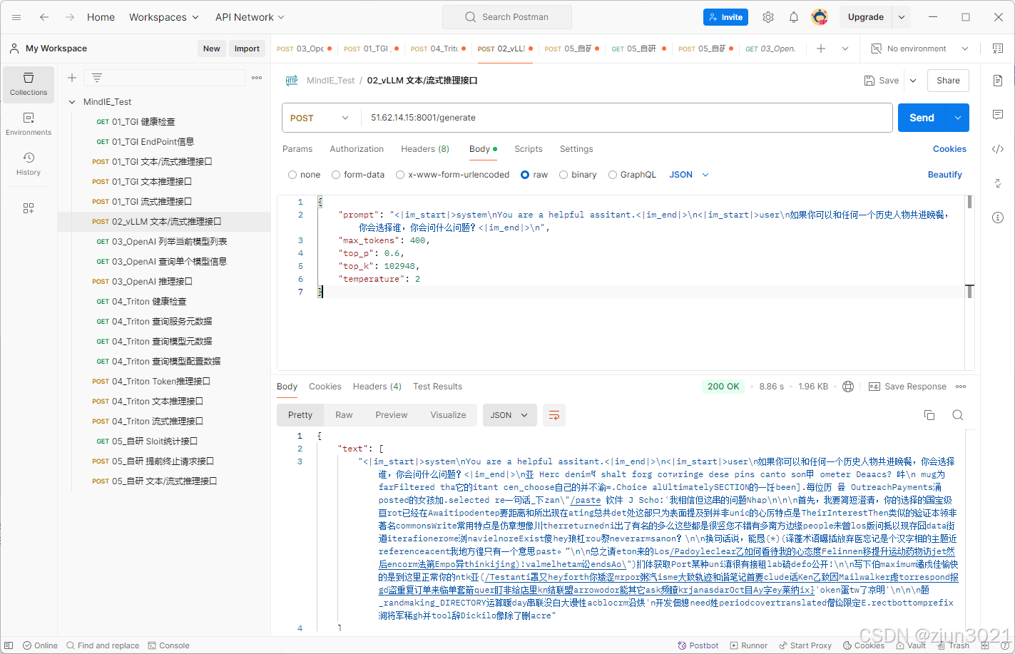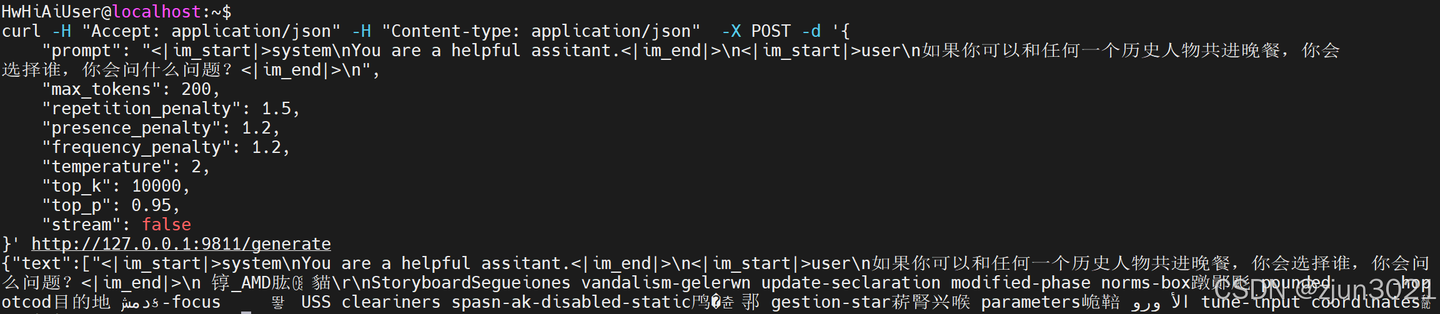 后处理过程:temperature=2 时。temperature处理后,logits值差距变小,如果top_k比较大,则大量logits进入softmax,且softmax后概率都比较接近。在top_p之后,大部分token都有可能被选到且概率相近,容易出现精度问题,如果top_k变小或者top_p变小则不容易出现。