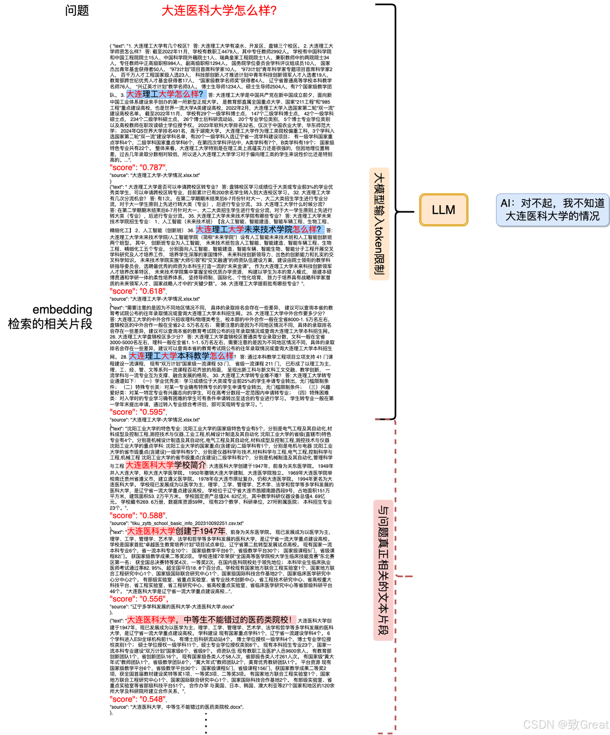 在实验中,一个典型的例子是“大连医科大学怎么样?”这个问题。在加入第三批数据之前,系统能够正确回答,但在加入第三批数据后,系统却错误地返回了与“大连理工大学”相关的信息。这是因为第三批数据中包含了与“大连理工大学”相关的句子,这些句子在向量空间中与“大连医科大学”非常相似,但实际上并不相关。