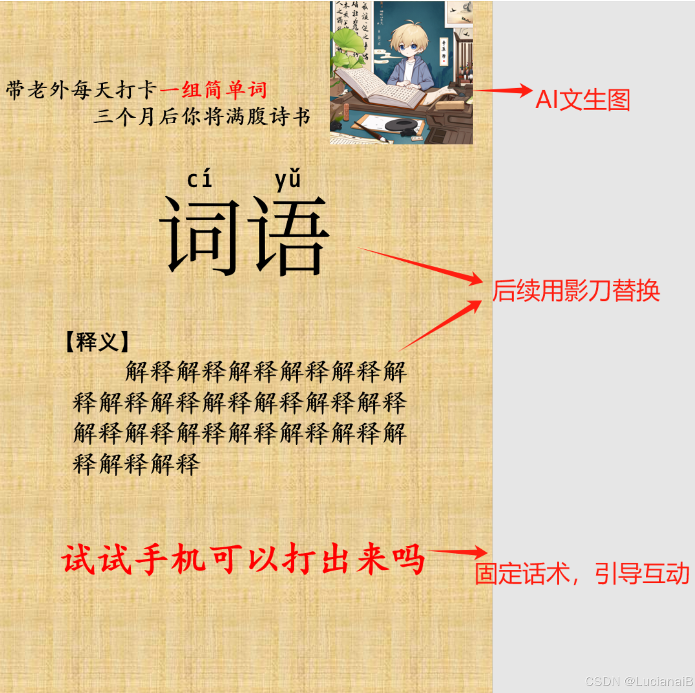 要注意的是词语区和解释区,这2个区域的文本必须先默认是【词语】和【解释解释解释解释解释解释解释解释解释解释解释解释解释解释解释解释解释解释解释解释解释】,后续会用RPA脚本自动替换,其他的地方随便你自己怎么改都行。