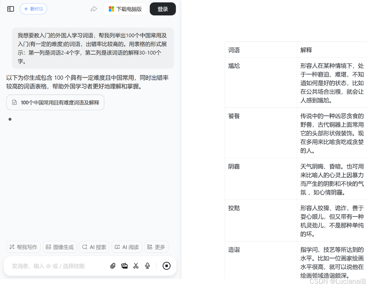 其次,作者讲解了如何通过AI批量生产词语和解释。推荐使用豆包(可通过Edge搜索找到)生成词语资源,提示词要求列举出100个中国常用且有一定难度、出错率高的入门词语,以表格形式展示,包括词语和解释两列。生成后,将数据复制到Excel表格中,为批量生产图片提供素材。