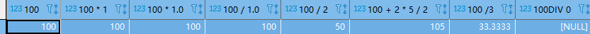 SELECT 100, 100 * 1, 100 * 1.0, 100 / 1.0, 100 / 2,100 + 2 * 5 / 2,100 /3, 100 DIV 0