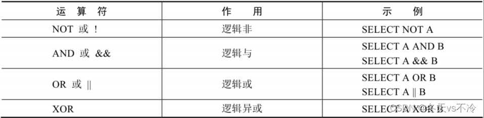逻辑异或(XOR)运算符是当给定的值中任意一个值为NULL时,则返回NULL; 如果两个非NULL的值都是0或者都不等于0时,则返回0;如果一个值为0,另一个值不为0时,则返回1。