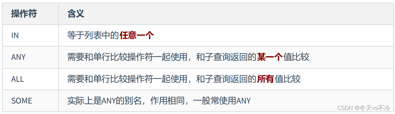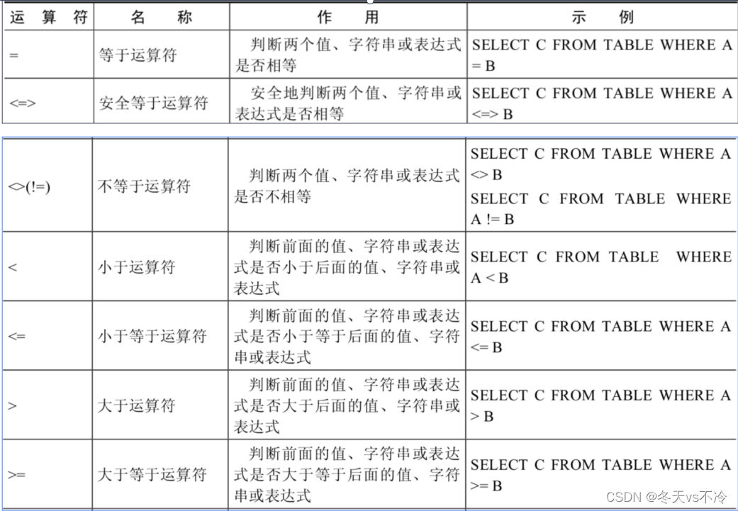 安全等于运算符(<=>)与等于运算符(=)的作用是相似的, 唯一的区别 是‘<=>’可以用来对NULL进行判断。在两个操作数均为NULL时,其返回值为1,而不为NULL;当一个操作数为NULL时,其返回值为0,而不为NULL。