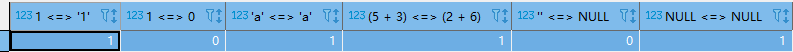 SELECT 1 <=> '1', 1 <=> 0, 'a' <=> 'a', (5 + 3) <=> (2 + 6), '' <=> NULL,NULL <=> NULL