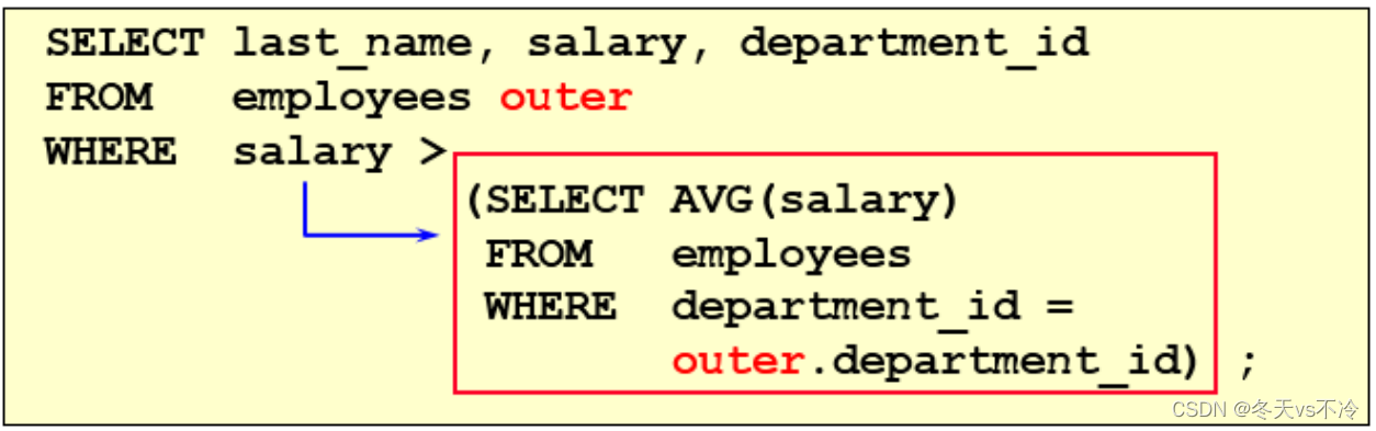 题目:查询员工中工资大于本部门平均工资的员工的last_name,salary和其department_id