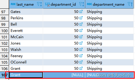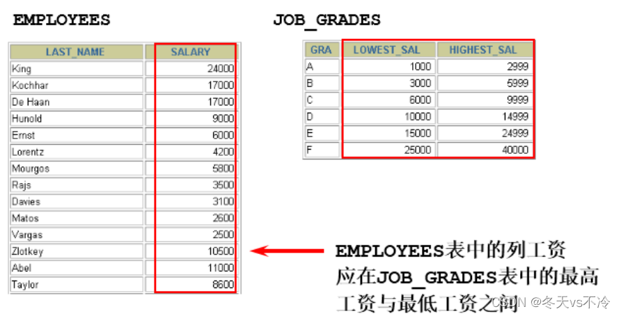 WHERE e.salary BETWEEN j.lowest_sal AND j.highest_sal;除了查询满足条件的记录以外,外连接还可以查询某一方不满足条件的记录