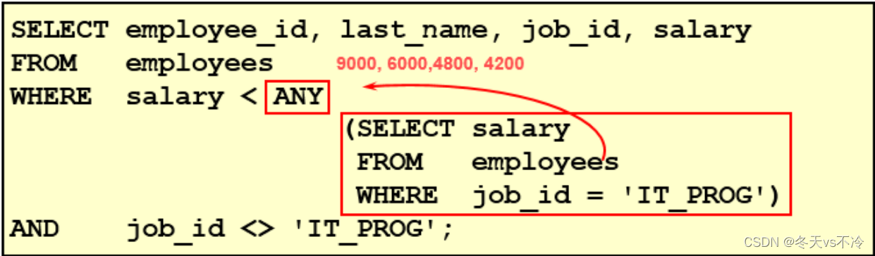 题目1:返回其它job_id中比job_id为‘IT_PROG’部门任一工资低的员工的员工号、姓名、job_id 以及salary