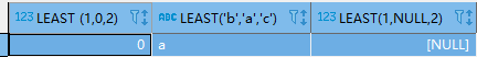 SELECT LEAST (1,0,2), LEAST('b','a','c'), LEAST(1,NULL,2);