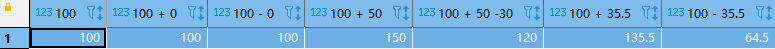 SELECT 100, 100 + 0, 100 - 0, 100 + 50, 100 + 50 -30, 100 + 35.5, 100 - 35.5