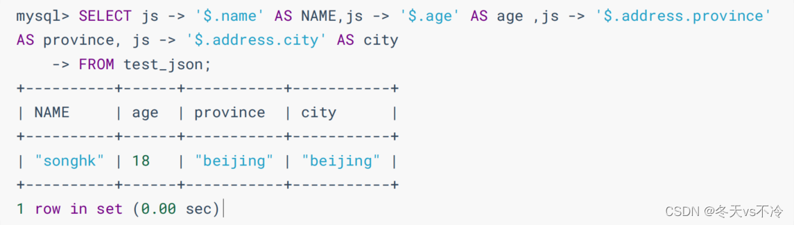 "address":{"province":"beijing", "city":"beijing"}}');当需要检索JSON类型的字段中数据的某个具体值时,可以使用“->”和“->>”符号。
