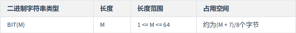 BIT类型,如果没有指定(M),默认是1位。这个1位,表示只能存1位的二进制值。这里(M)是表示二进制的 位数,位数最小值为1,最大值为64。