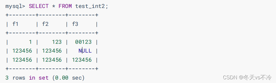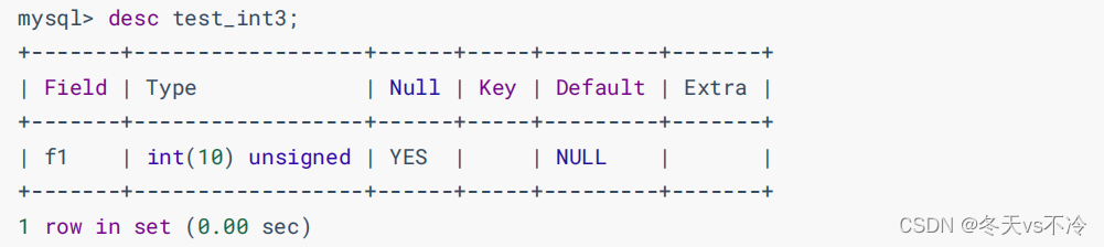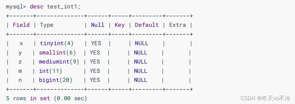 ( x TINYINT, y SMALLINT, z MEDIUMINT, m INT, n BIGINT );查看表结构 (MySQL5.7中显式如下,MySQL8中不再显式范围)
