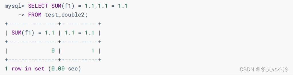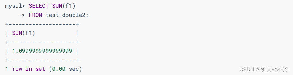 浮点数类型有个缺陷,就是不精准。下面我来重点解释一下为什么 MySQL 的浮点数不够精准。比如,我 们设计一个表,有f1这个字段,插入值分别为0.47,0.44,0.19,我们期待的运行结果是:0.47 + 0.44 + 0.19 = 1.1。 而使用sum之后查询: