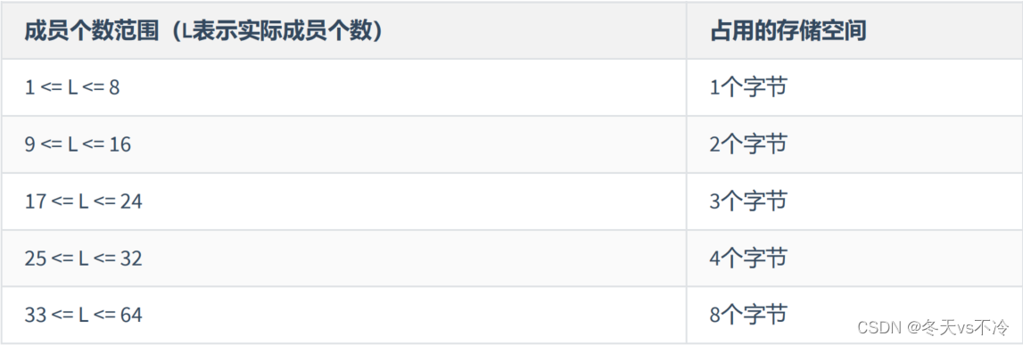 VALUES('UNKNOW');当SET类型包含的成员个数不同时,其所占用的存储空间也是不同的,具体如下: