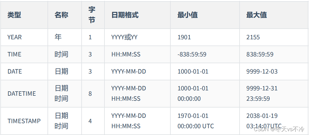 YEAR类型用来表示年份,在所有的日期时间类型中所占用的存储空间最小,只需要 1个字节 的存储空间。