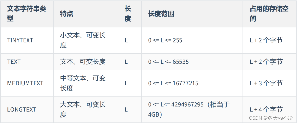 MySQL中,文本字符串总体上分为 CHAR 、 VARCHAR 、 TINYTEXT 、 TEXT 、 MEDIUMTEXT 、 LONGTEXT 、 ENUM 、 SET 等类型。