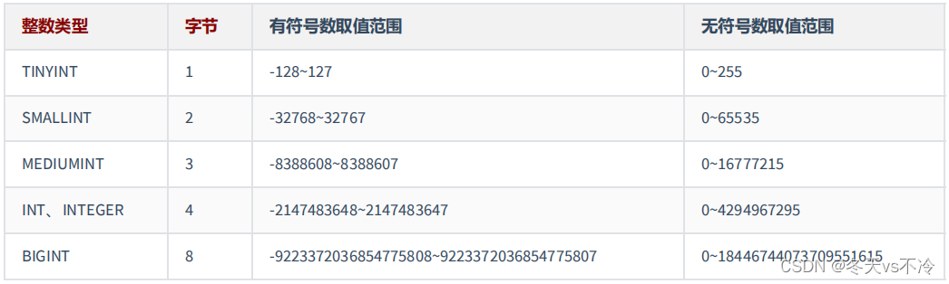 整数类型一共有 5 种,包括 TINYINT、SMALLINT、MEDIUMINT、INT(INTEGER)和 BIGINT。 它们的区别如下表所示: