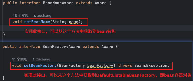 }BeanNameAware接口、BeanClassLoaderAware接口、BeanFactoryAwaresetxxxAware方法中拿到对应需要的属性,如:bean名称、bean容器