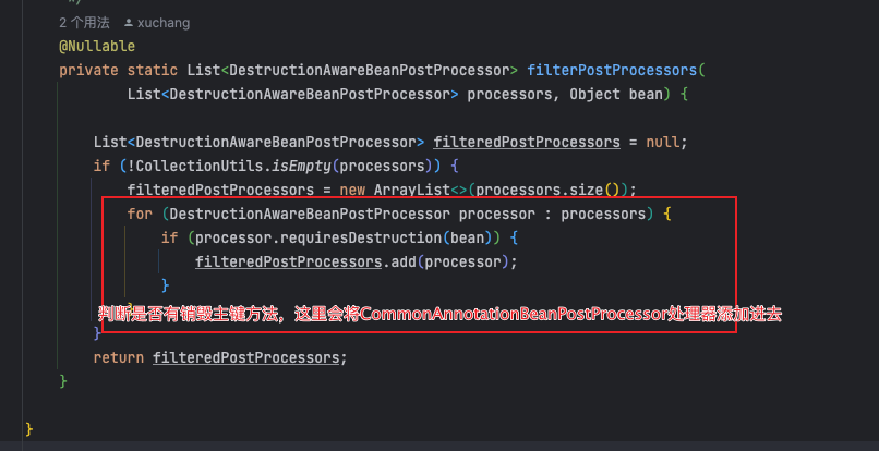 }注册销毁方法,DestructionAwareBeanPostProcessor、DisposableBean 接口、自定义销毁方法protected void registerDisposableBeanIfNecessary(String beanName, Object bean, RootBeanDefinition mbd) {