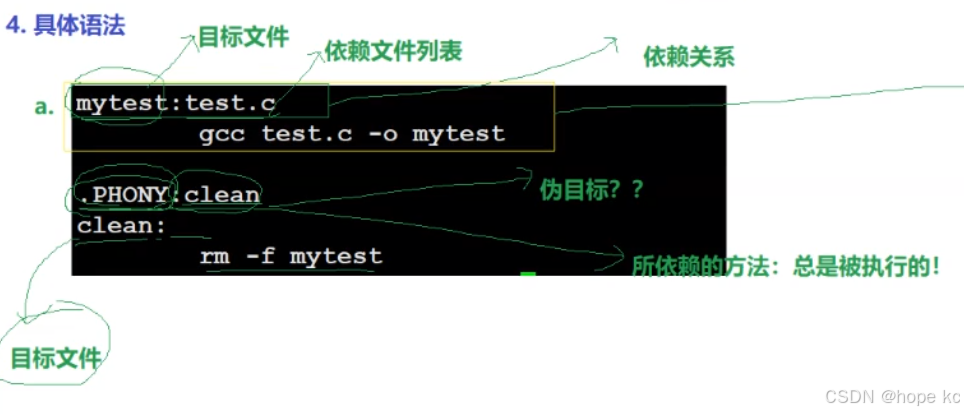 :前为要生成的可执行程序的名字,:后为源文件(第一行为 依赖关系)依赖方式)