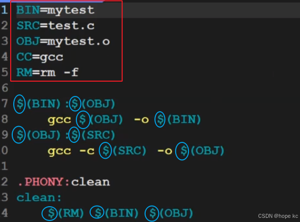 之前我们在makefile里都是直接写文件名的,这里使用 类似宏替换 的方式替换命令和文件,记住,在使用替换时要加上$()