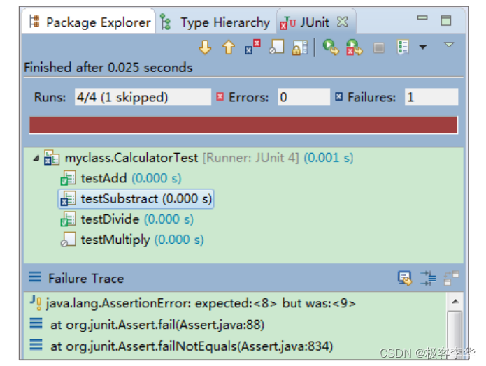 (1)在测试类“CalculatorTest.java”上单击右键,在弹出 的菜单中选择“Run As”→“JUnit Test”。运行结果如图 10 所示。进度条是红 色表示发现错误,具体的测试结果在进度条上面有表示。