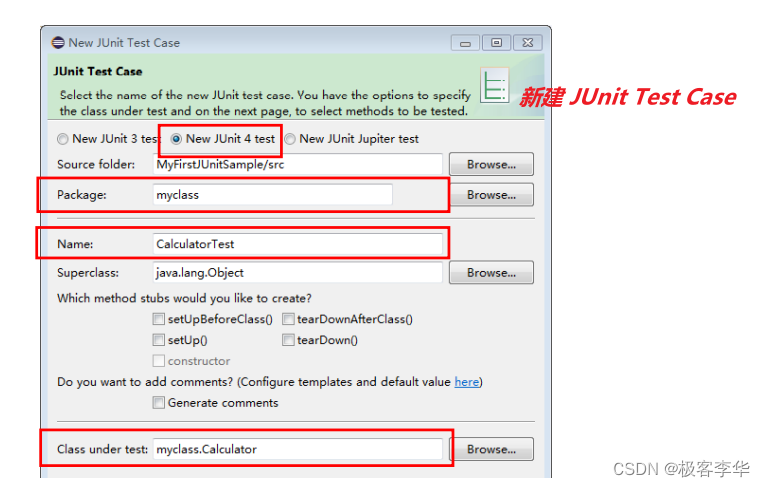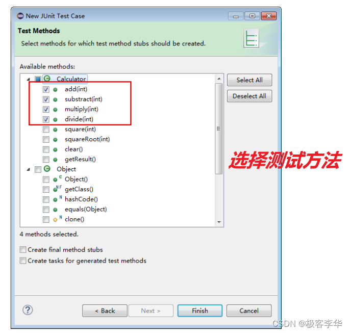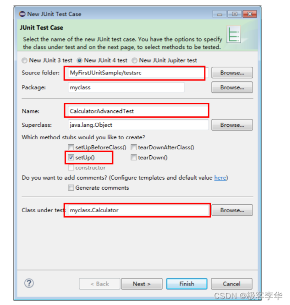 步骤: 右键单击“Calculator”类,在弹出的菜单中选择“New”→“JUnit Test Case”。如下图修改“Source Folder” 为“testsrc”,测试类的 Name 为“CalculatorAdvancedTest”。单击“Next”,在 Test Mothods 列表中选 择“square”方法。单击“Finish”即可。