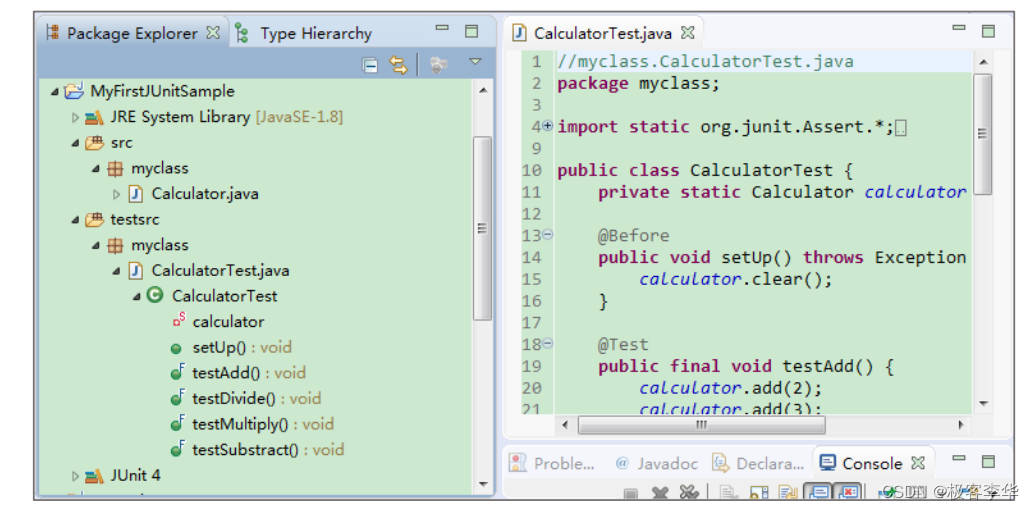该测试类包括四个测试方法,分别对应测试 Calculator 的 add、substract、 multiple、divide 方法。