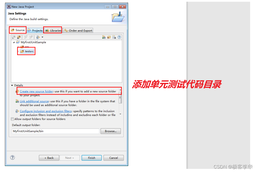 (1)新建单元测试代码目录(testsrc) 在“Source” 选项卡中单击“create new source folder”,创建新的 source folder——testsrc (testsrc 用于放测试代码)然后单击 finish。